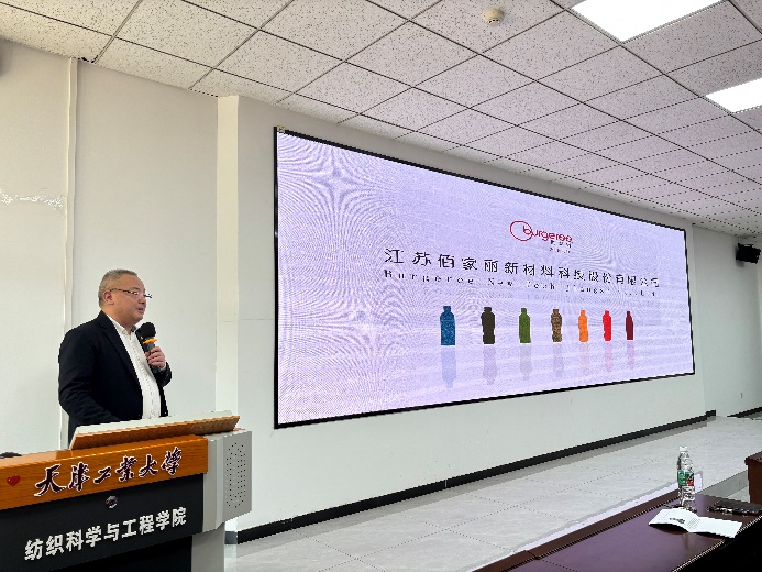 江苏佰家丽新材料公司董事长左洪运从自身经历出发,首先介绍了公司的创立及发展历程,并结合公司在PET材料和可降解纤维材料、保温声学材料、非织造材料新型制备工艺方面的产品优势,分享了设立的新佰丽专项奖,将为学生在课程学习实践过程中的产品创新落实落地、推广应用服务。