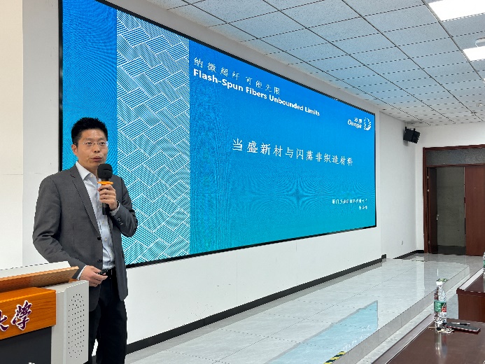厦门当盛新材料公司防护科技市场总监王升介绍了公司在闪蒸无纺布方面的主要生产研发情况,包括现有成果、产业化背景、知识产权和品质认可,以及目前闪蒸无纺布在个人防护、工业包装、创意设计、建筑防护等领域的应用情况。
